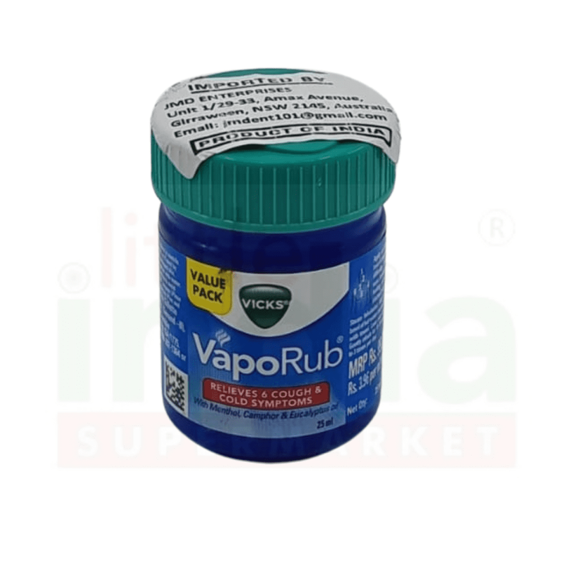 Vicks Vaporub 25Ml. Welcome to Indi-Mart Grocery Store, your premier destination for quality grocery products in Sydney! Our carefully curated selection of items ensures a delightful shopping experience that caters to your every need. Located conveniently in Sydney, Indi-Mart Grocery Store is your one-stop-shop for all things grocery. Embrace the Indi-Mart Grocery Store experience and elevate your shopping journey with quality, variety, and convenience. Shop with us today and let Indi-Mart Grocery Store be your preferred choice for grocery shopping in Sydney!